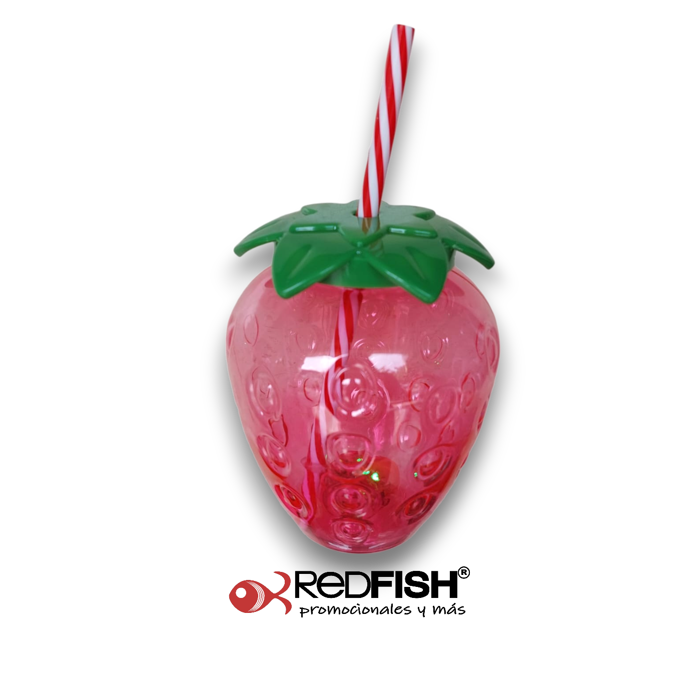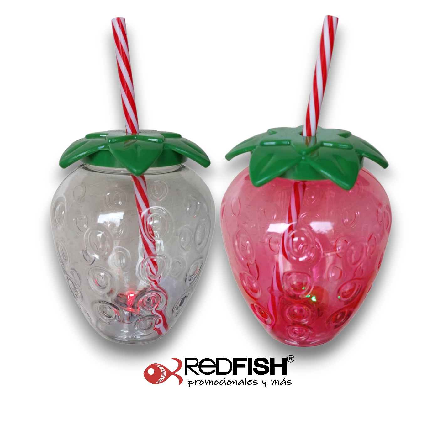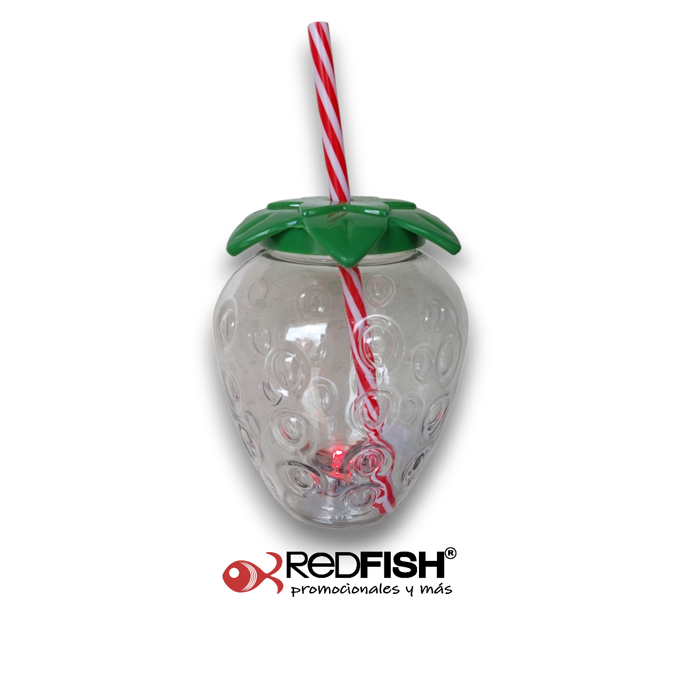 Ánfora transparente en forma de fresa con tapa de rosca y popote (tiene luz led al exterior de la base)