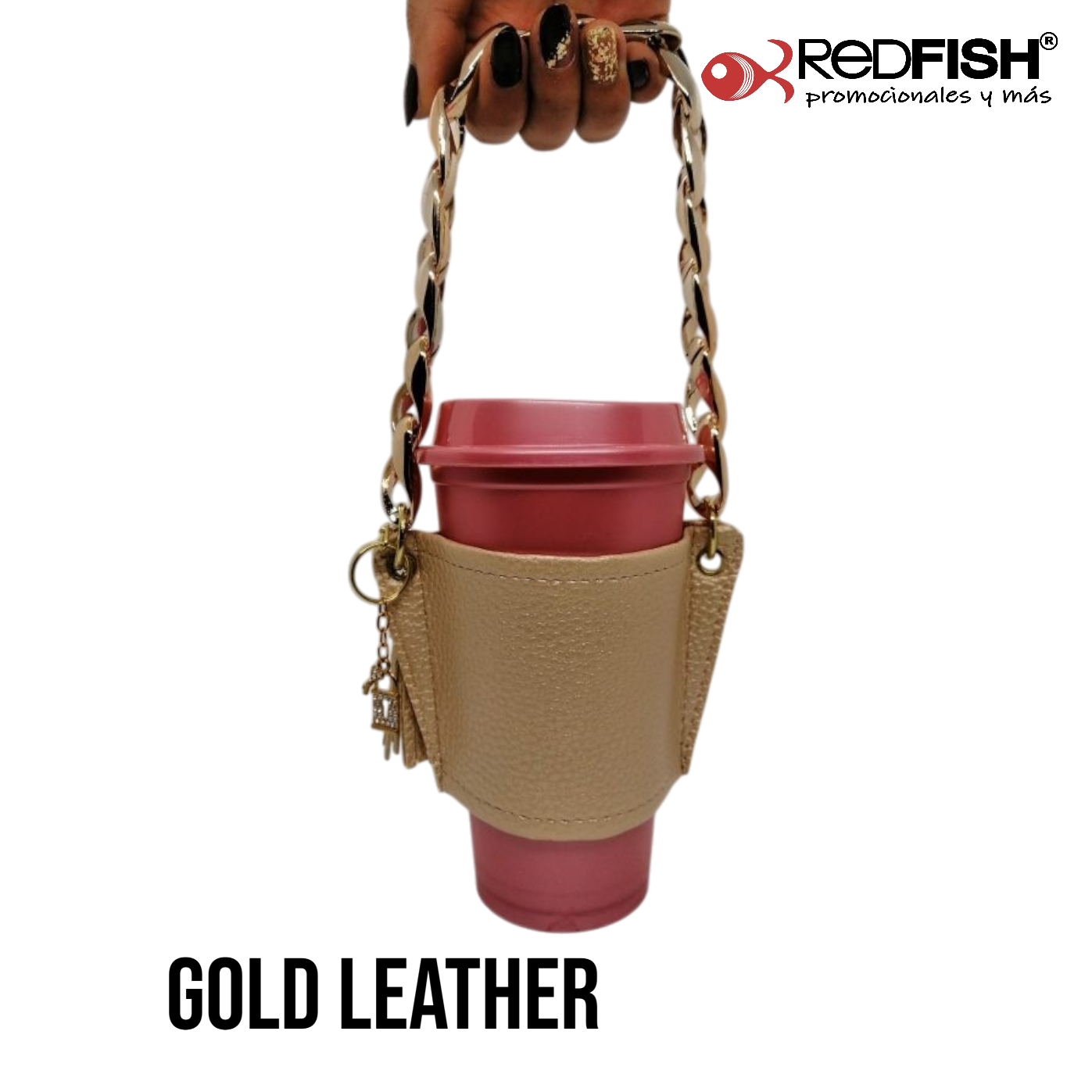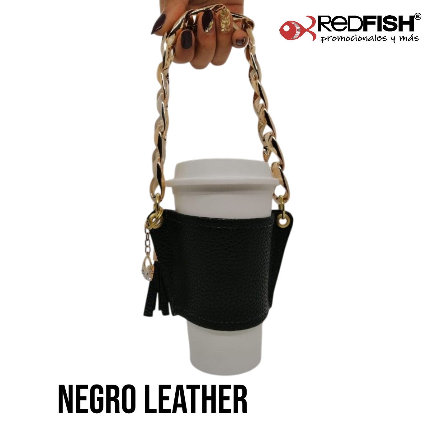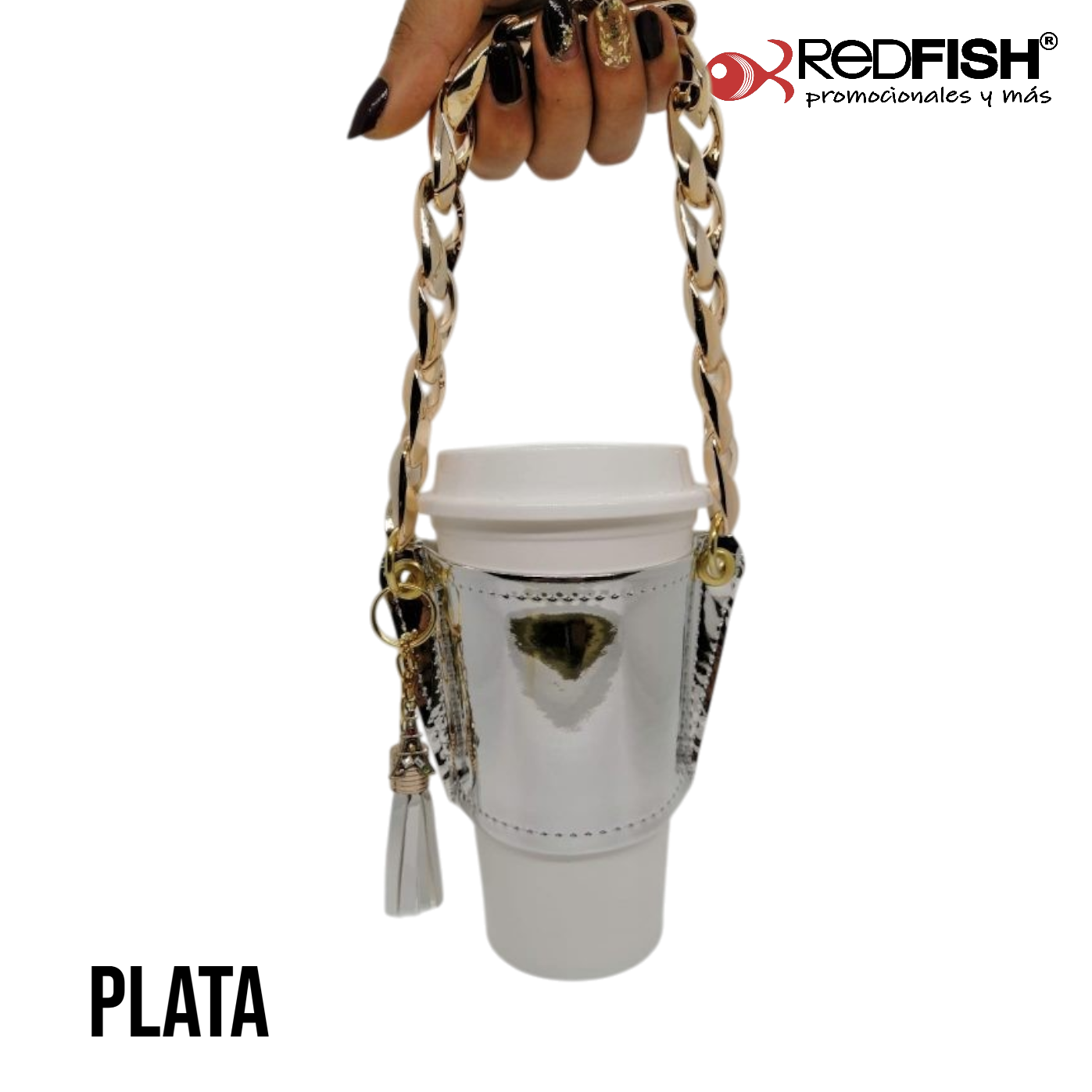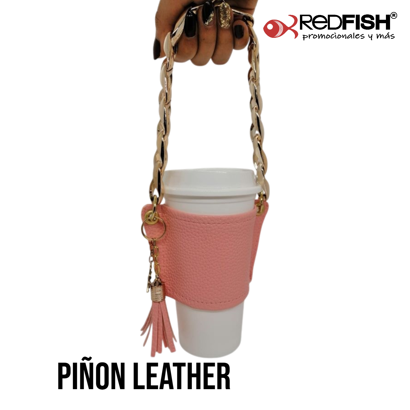 Material: cadena de plástico, porta vaso imitación piel.