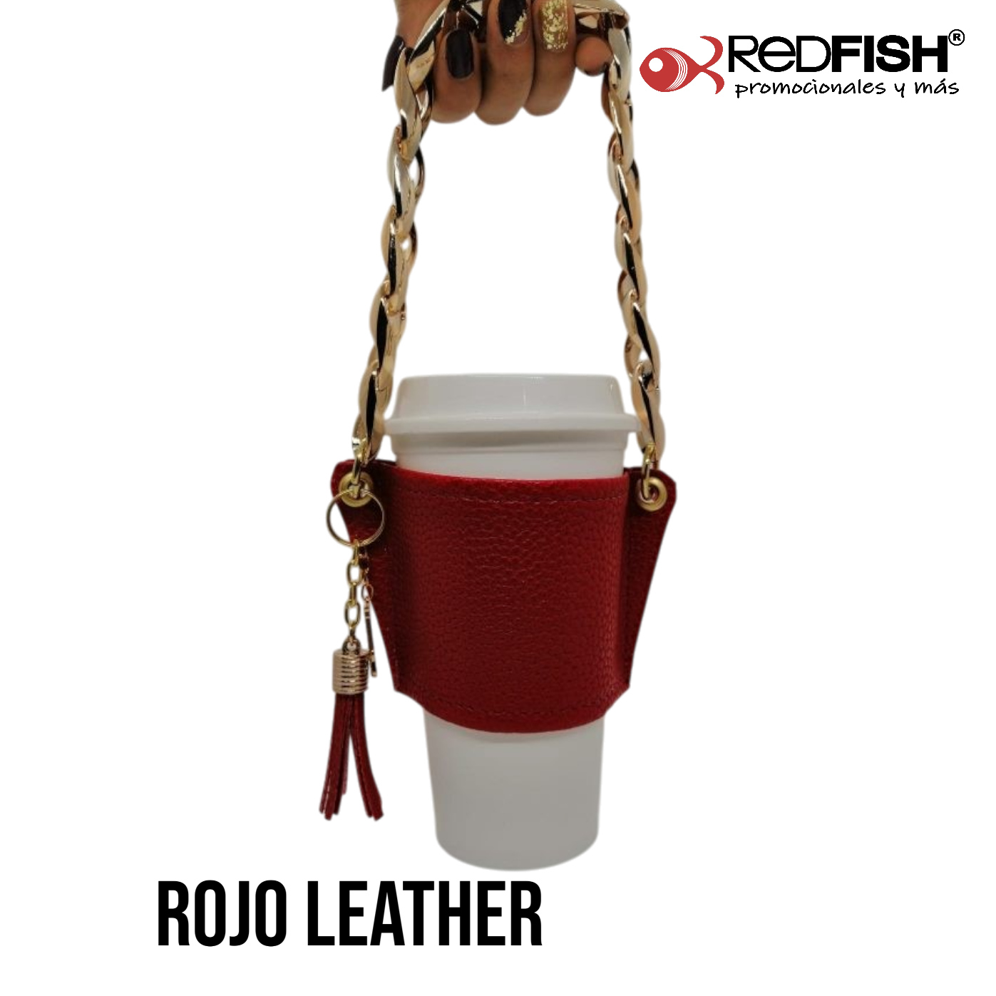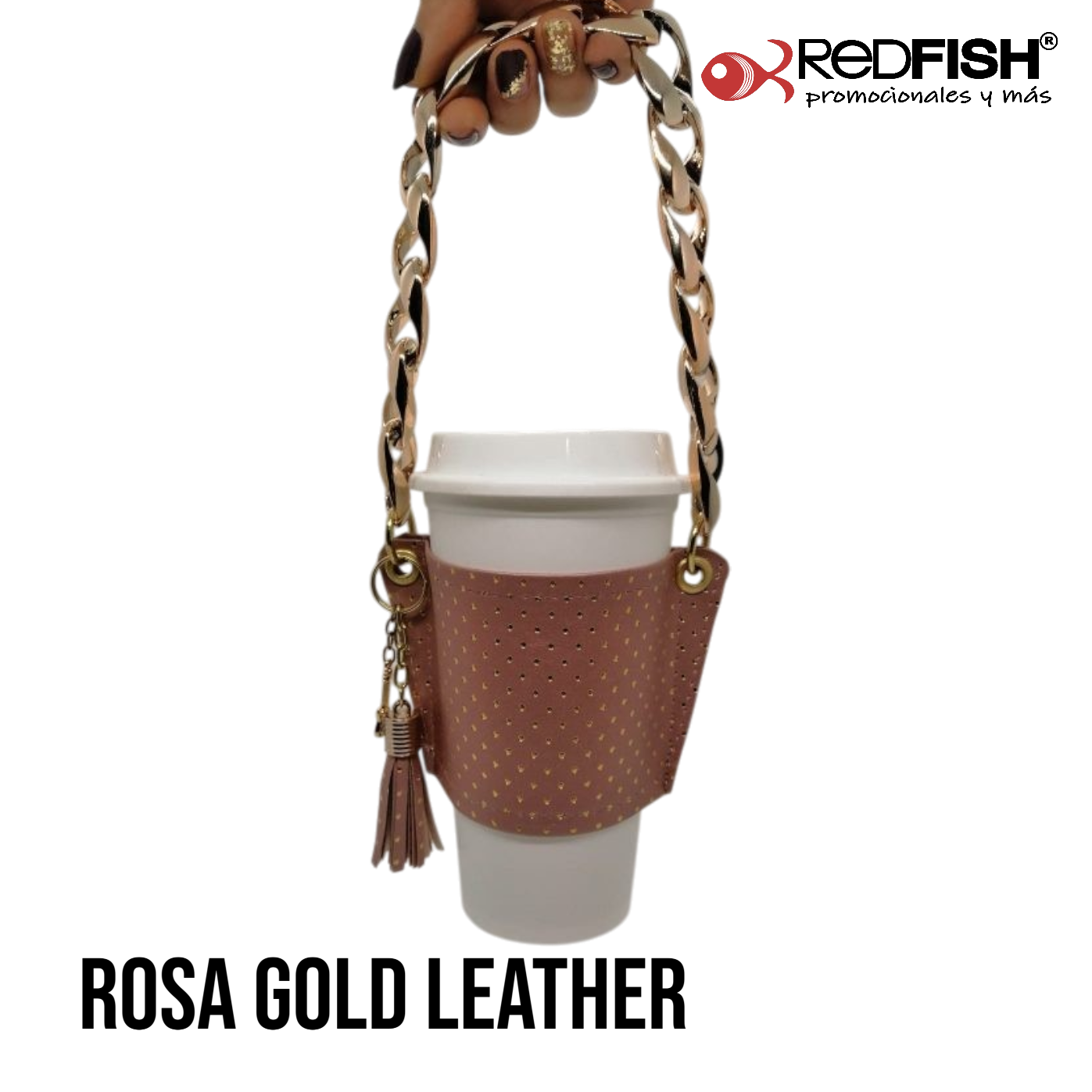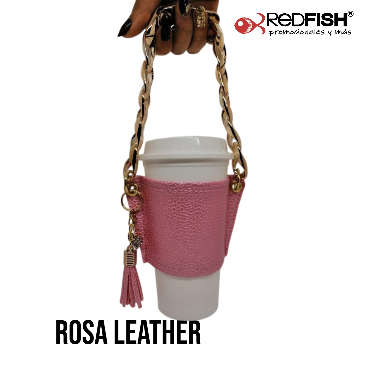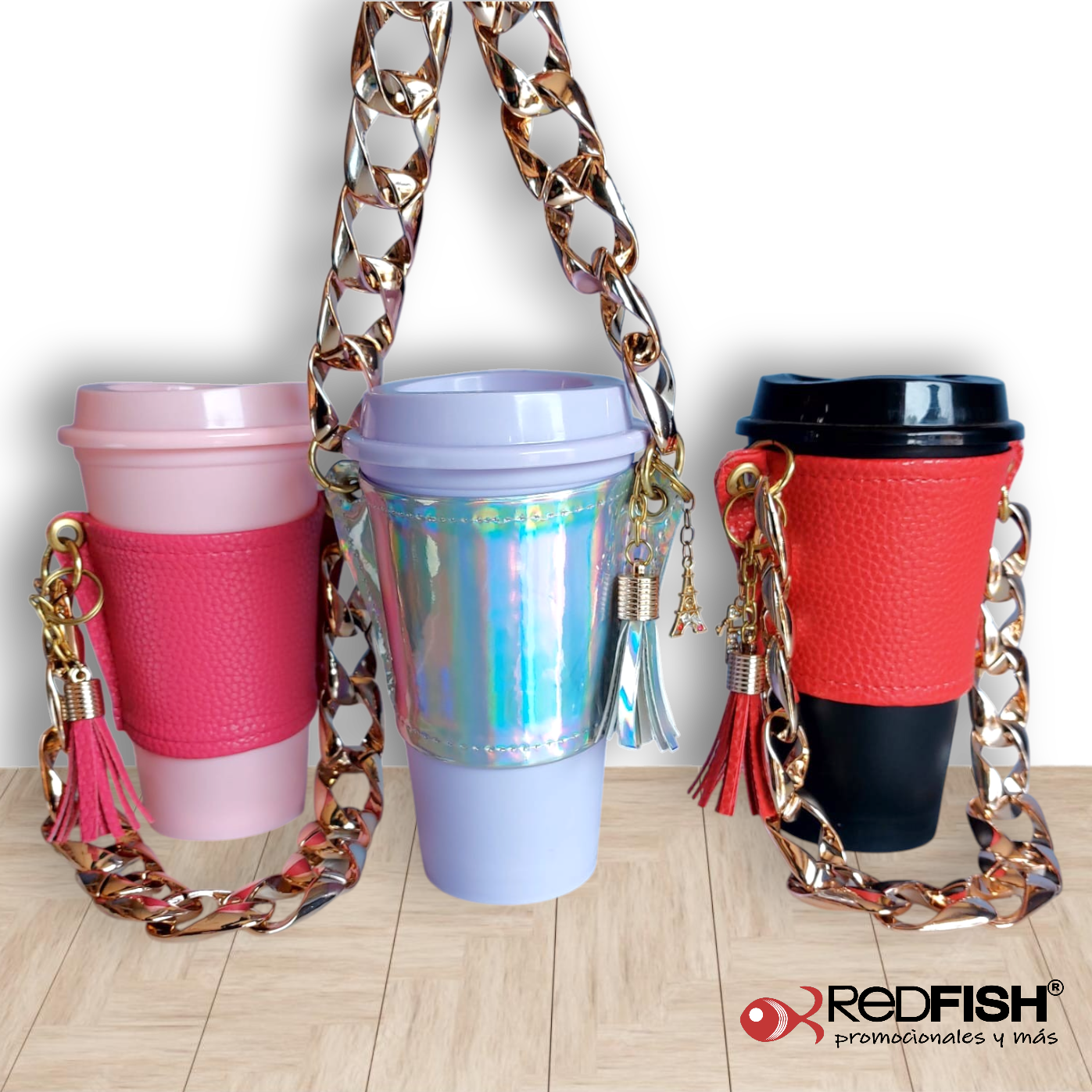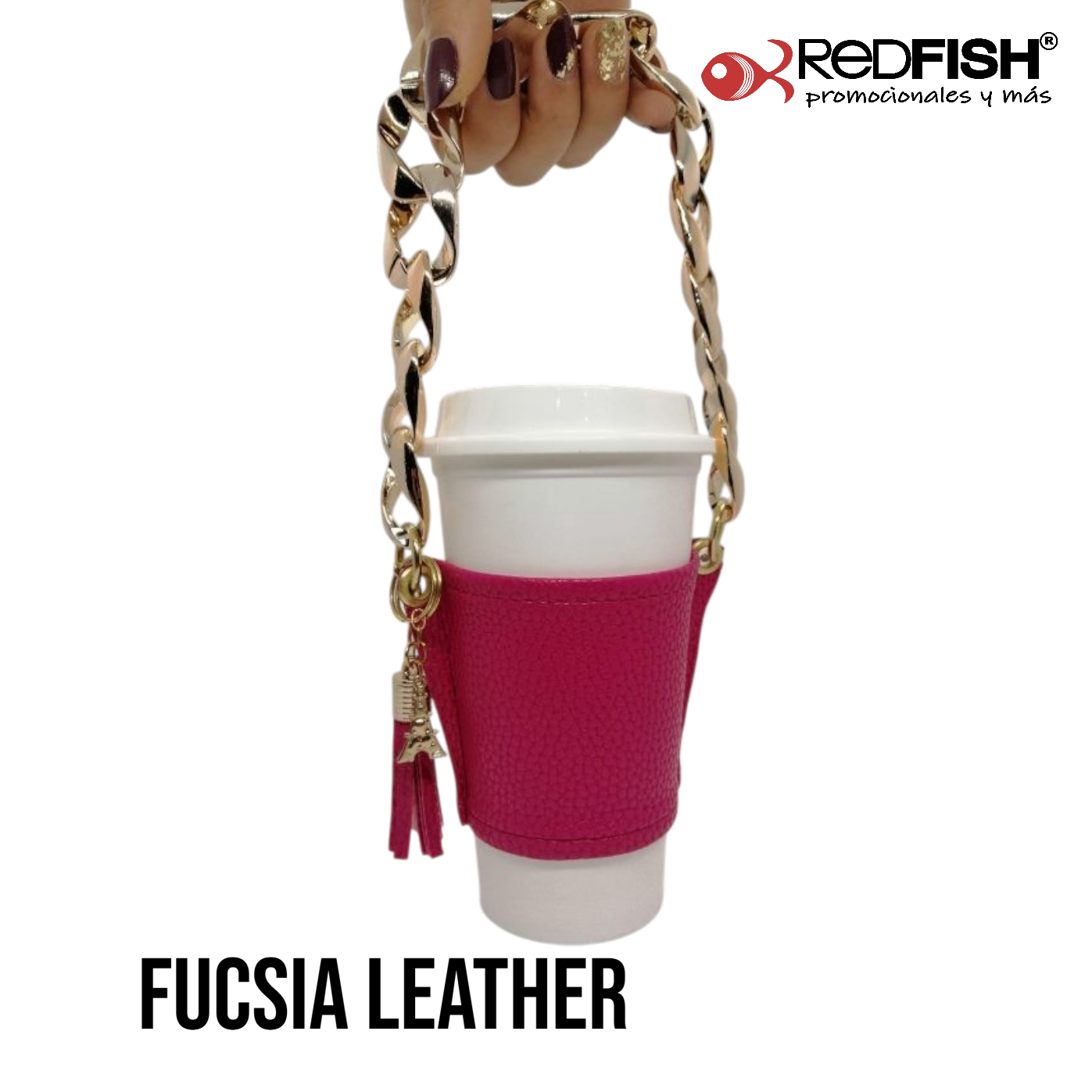 Material: cadena de plástico, porta vaso imitación piel.