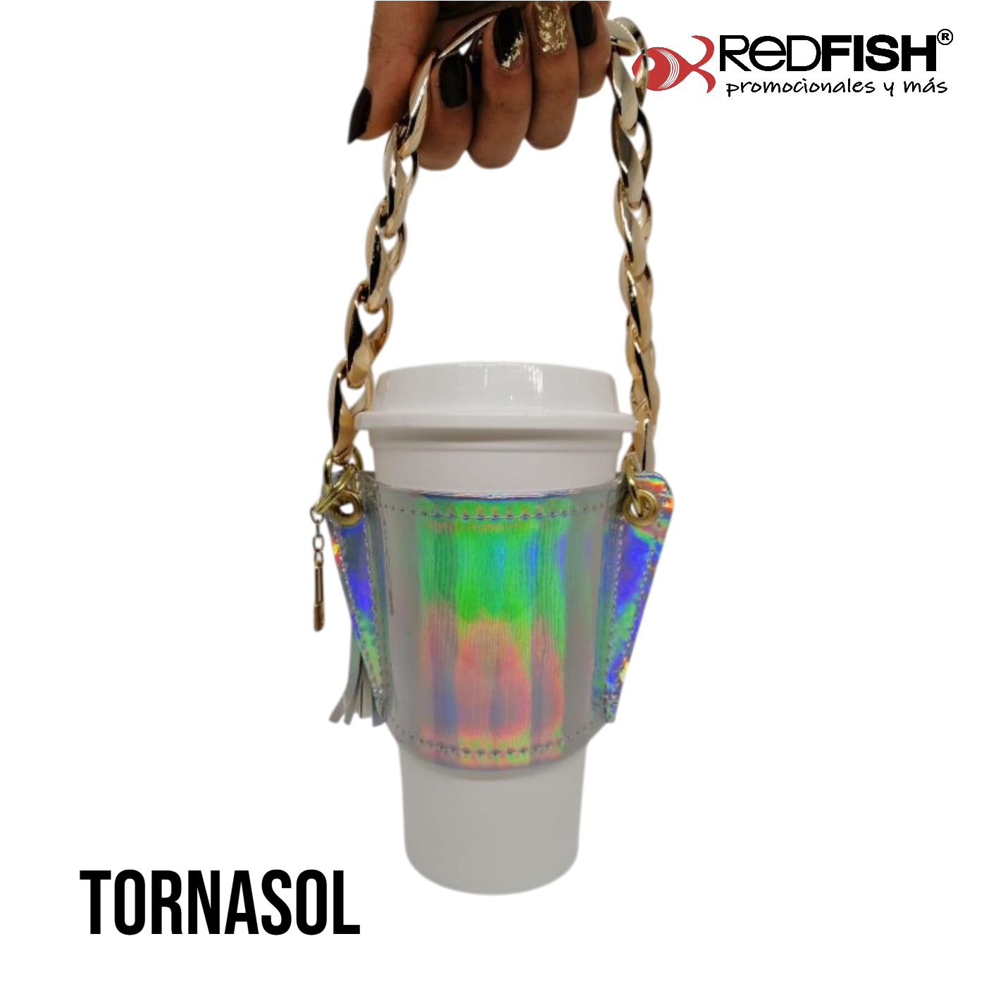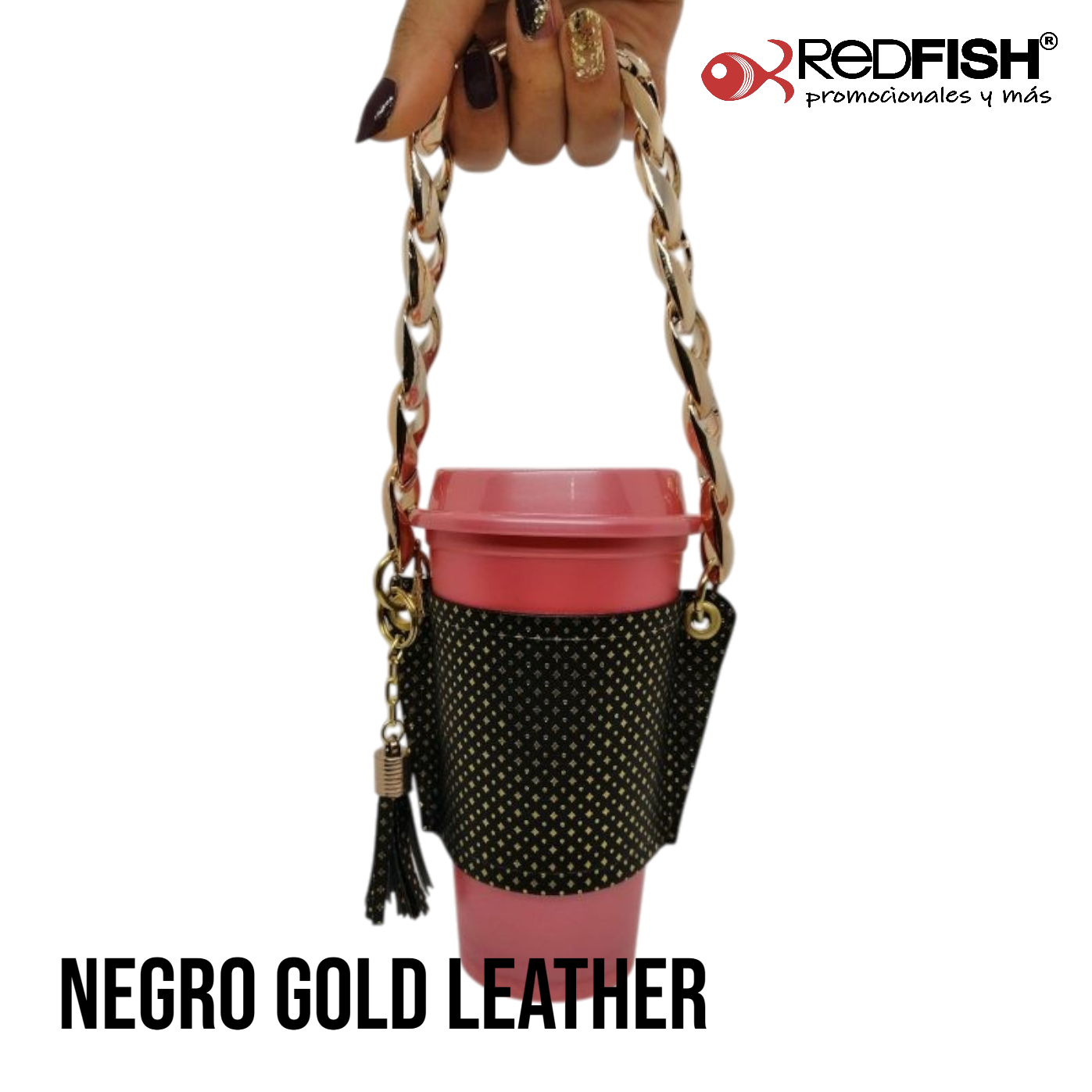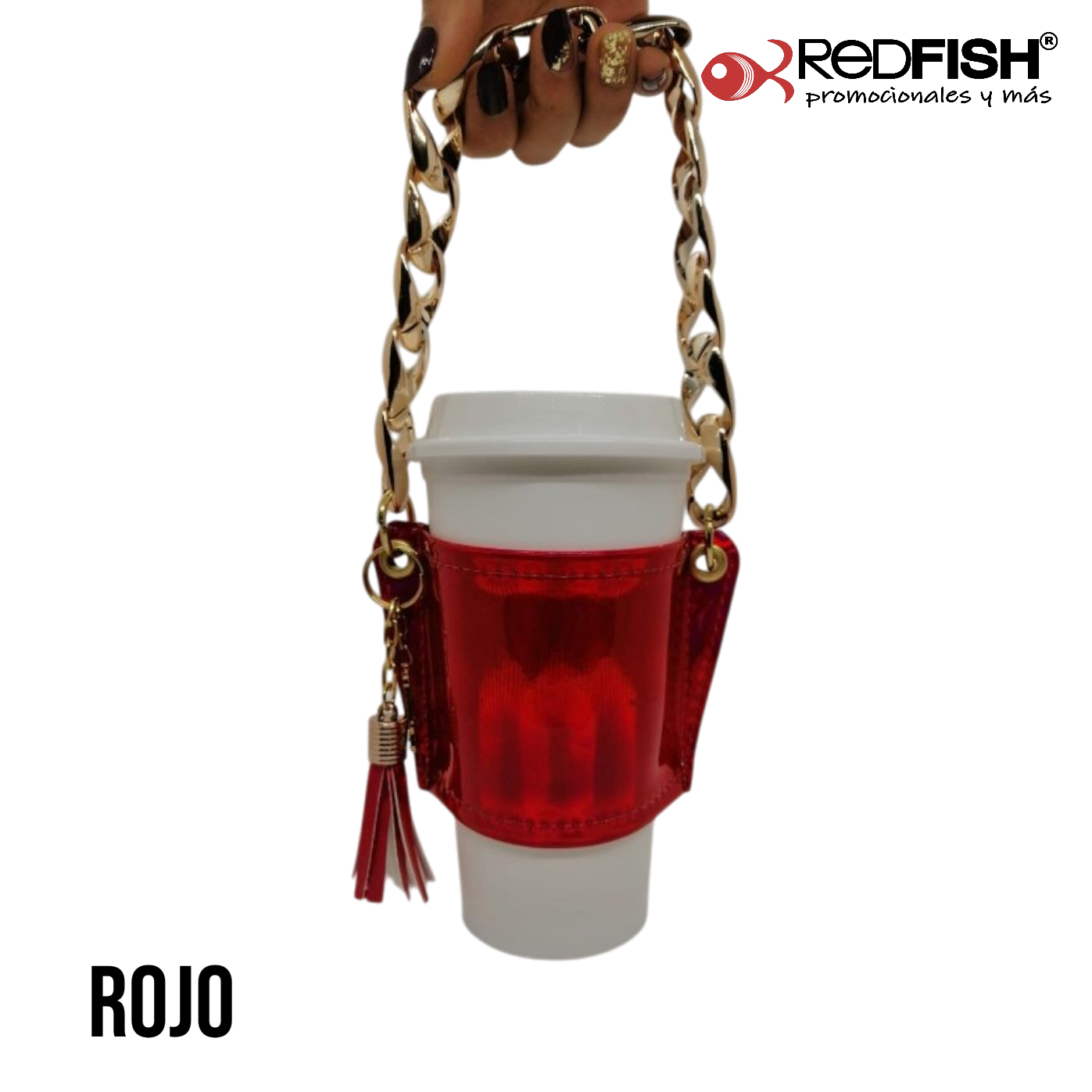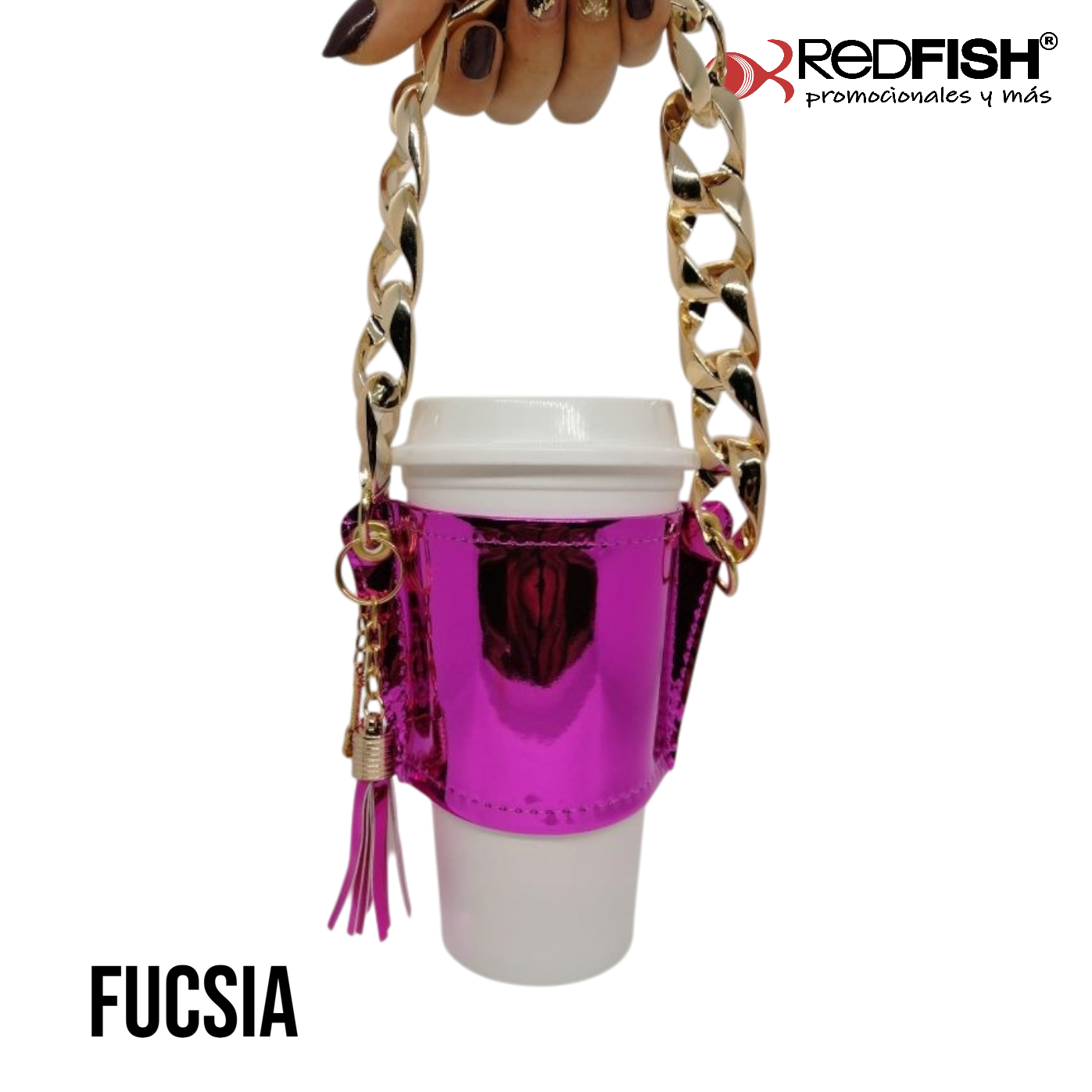 Material: cadena de plástico, porta vaso imitación piel.