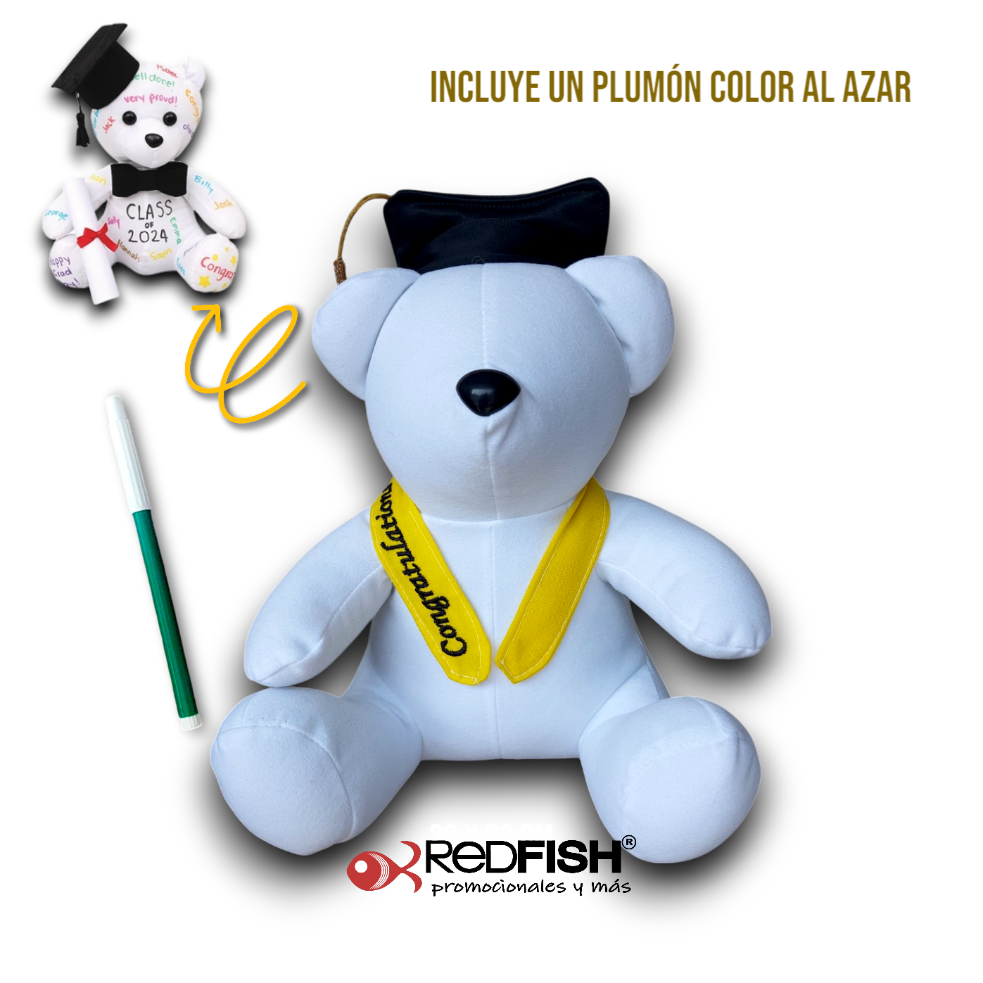 Oso blanco de peluche para firmas, temática de graduación. Incluye 1 plumón de color al azar.