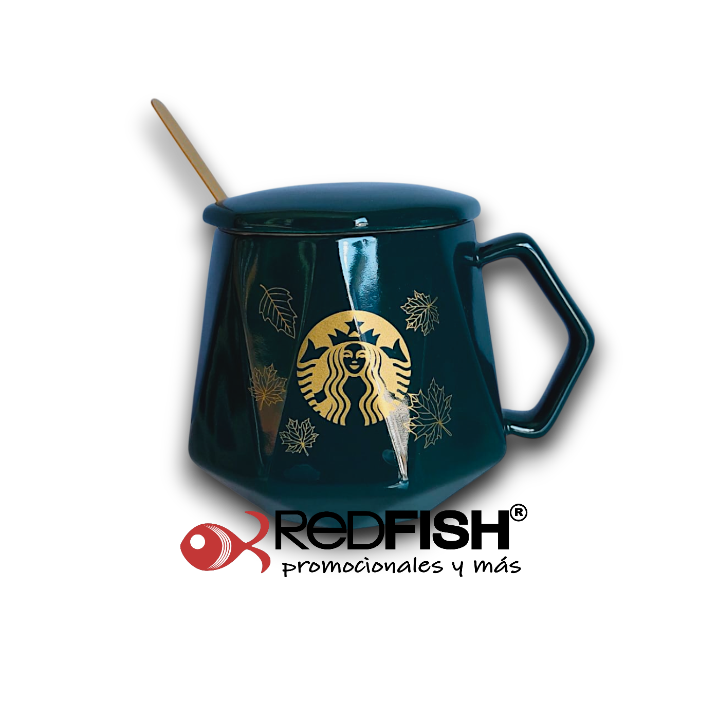 Taza cerámica octagonal tipo Starbucks con tapa y cucharilla