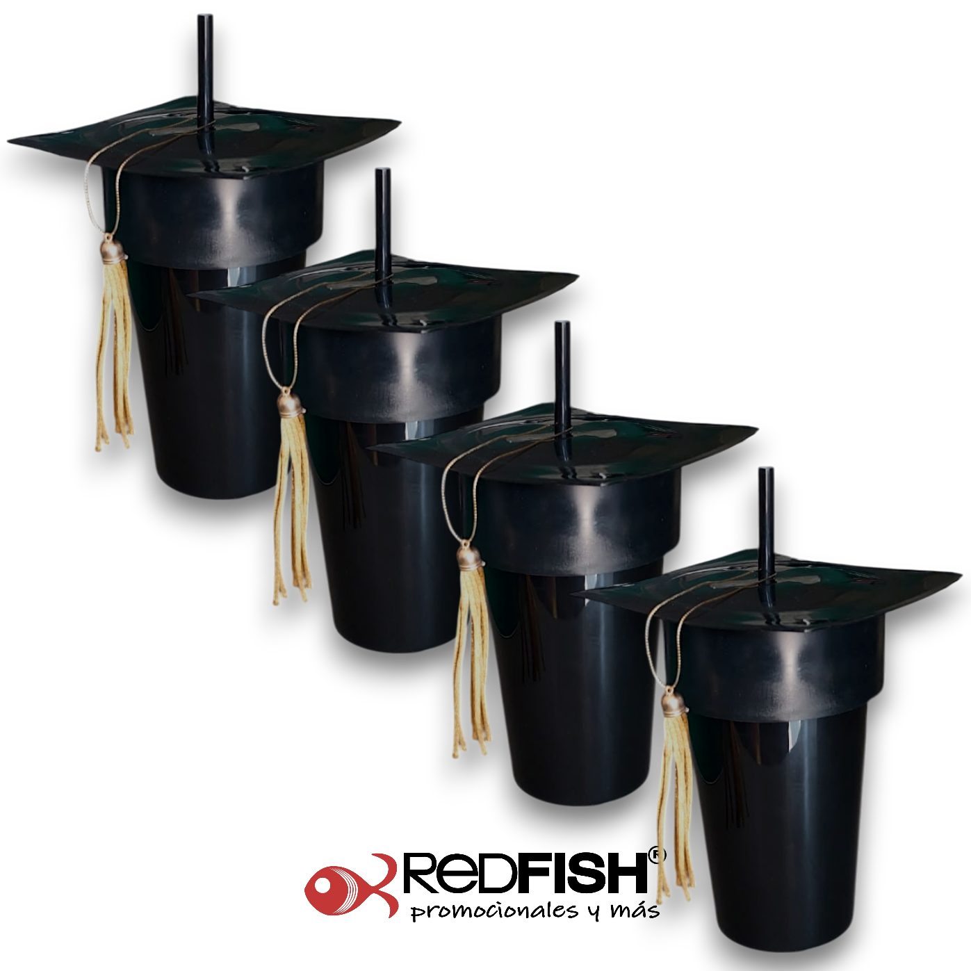 Vaso color negro con popote y tapa en forma de birrete, con borla.