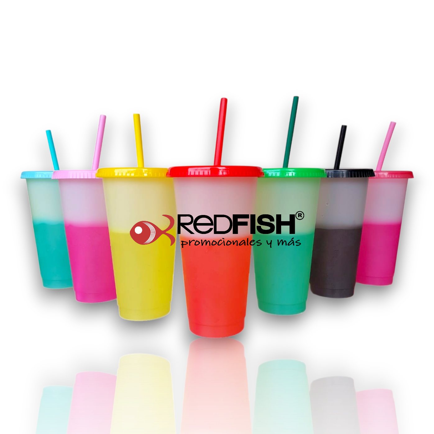 Vaso con tapa y popote, que cambia de color al contacto con agua fría.