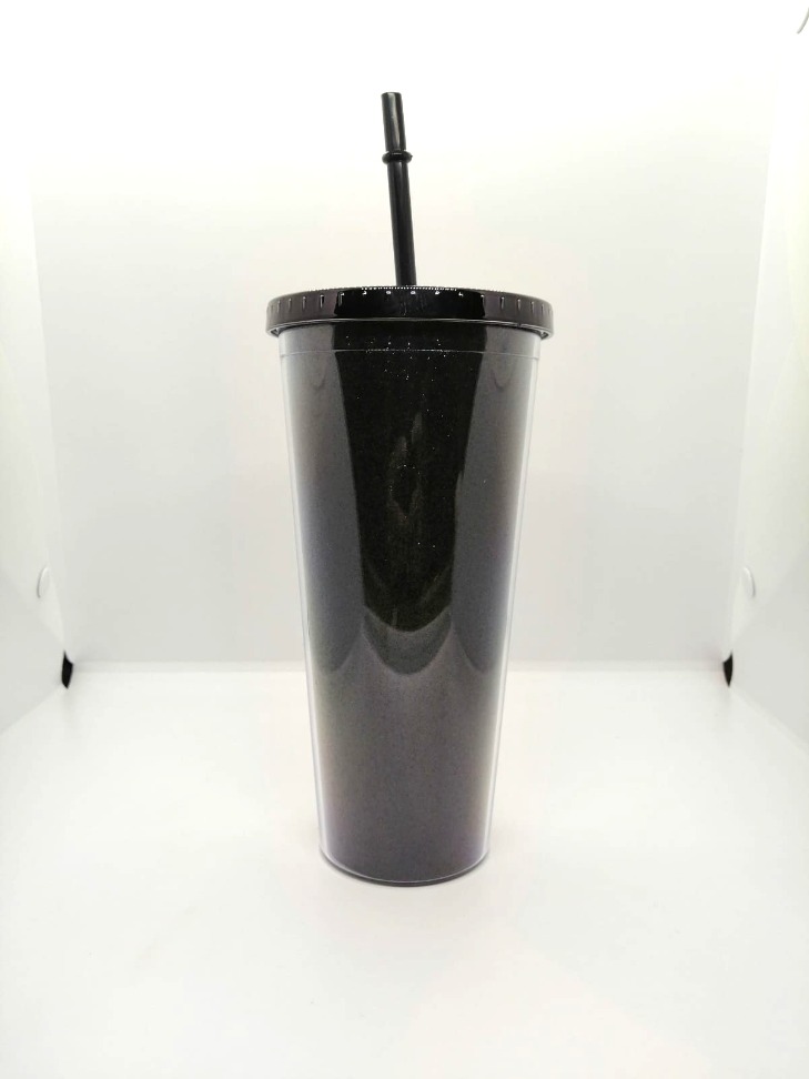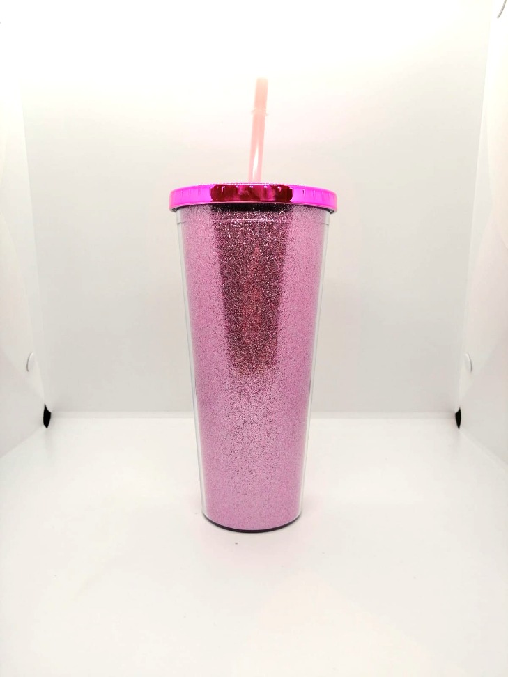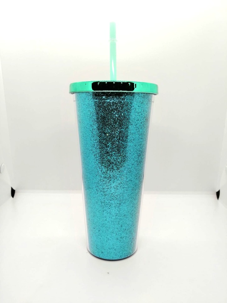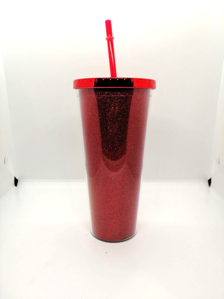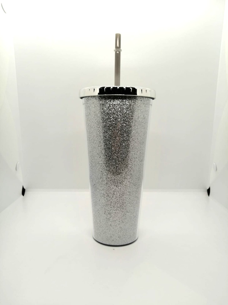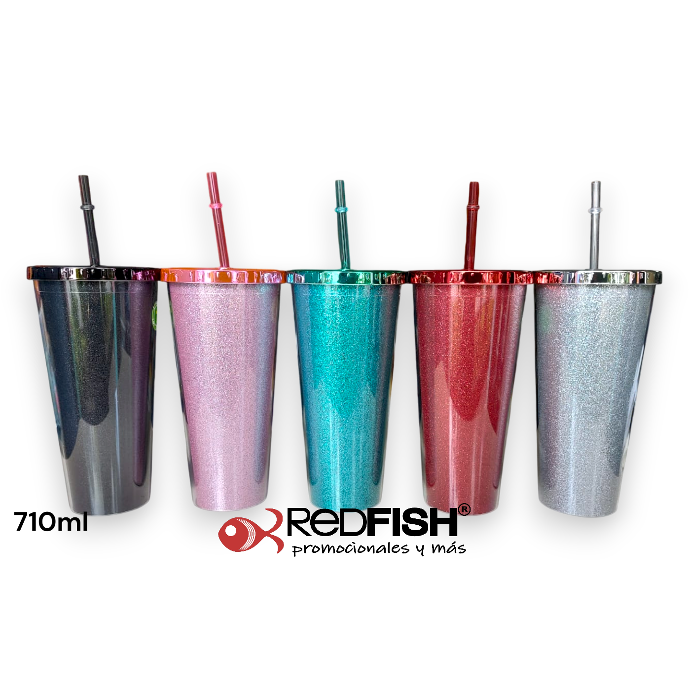 Vaso de acrílico doble pared, con glitter, incluye tapa con seguro hermético y popote.